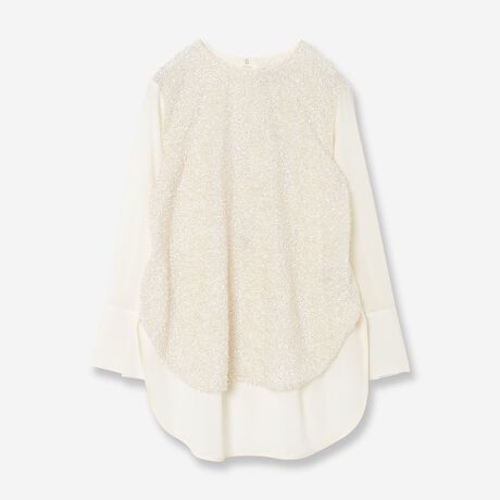 ジャカード素材を前身頃に、その他はフラットなボイル素材を使用したコンビブラウス。