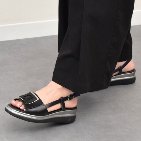 バックルウエッジバックバンドサンダルは軽いソールとクッションインソールが特徴的な一足。