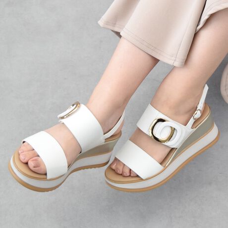 バックルデザインが特徴的なウエッジサンダルは、ソールの前後の高低差があまり無く、高さを感じさせない履き心地になっています。