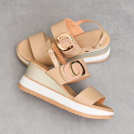 バックルデザインが特徴的なウエッジサンダルは、ソールの前後の高低差があまり無く、高さを感じさせない履き心地になっています。