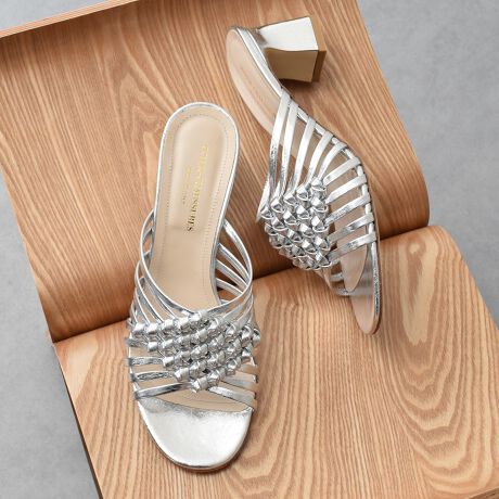 ラウンドトウのフレアヒールサンダルは細いストラップと結びのディテールがエレガントな一足です。