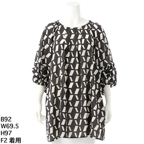 [型番:3252710]ラクープの今年のなるに向けてのプリントチュニックブラウスです。華やかなモダンな幾何柄を選びました。モノトーンなので派手すぎず合わせやすいプリント柄です。襟ぐりが優しいラインのスクエアカラーなので、フェイスラインもすっきりと見せてくれるデザインです。軽やかな合繊の素材なので、落ち感もあり、シルエットもゆったりとしているので、夏も涼しく着やすいブラウスです。きちんとした席にも通用する華やかさのあるアイテムです。オンオフ、コーディネイトを楽しめるチュニックブラウスです。コーディネイトのポイントに1枚でもさまになるブラウス、おすすめです。