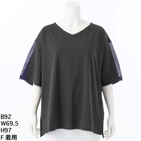 フレアースリーブの中心部分がメッシュ生地で切り替えられたこのVネックTシャツは、清涼感あふれるデザインが特徴です。