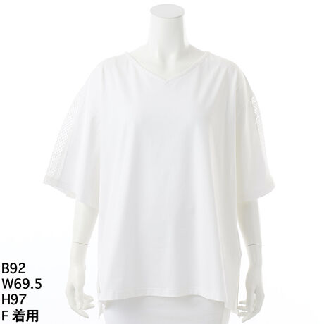 フレアースリーブの中心部分がメッシュ生地で切り替えられたこのVネックTシャツは、清涼感あふれるデザインが特徴です。