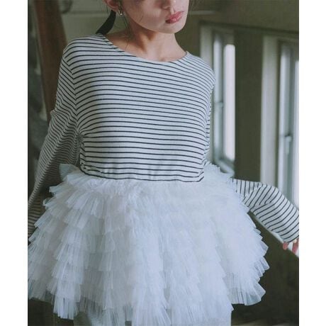 定番のボーダーカットソーに女性らしさをミックスしたトレンドトップス。ボリュームたっぷりなチュールが可愛さをプラスし、一枚で華やかなスタイリングに引き立ててくれます。ワイドからタイトまでどんなフォルムのボトムにも合わせやすくデイリー使いにぴったりです◎