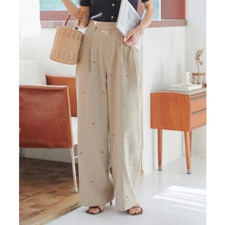 華やかな配色の花柄刺繍がアクセントとなった、上品で女性らしいツータックストレートパンツ。ウエスト回りをカバーするツータックデザインで、リラックス感のあるシルエットを作り出し、スタイルを引き立てます。後ろウエストはゴム仕様で、お尻部分にはギャザーが寄っているため、気になるラインを拾いにくく、なおかつストレスフリーな着心地で◎