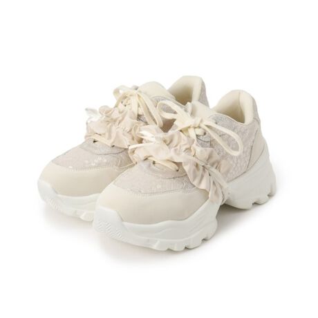 アッパーにはトレンドのスパンコール+グリッターを使用しているので、フリルのストラップを外しても甘めデザイン♪