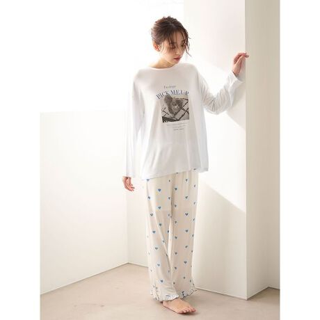 とろんとしたなめらかな肌触りのカットソーに、3種類の柄をプリントしたロングパンツです。
