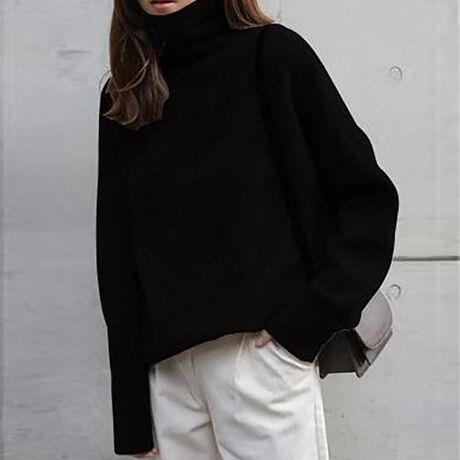 緩めのハイネックに肩落ちのドロップショルダーが抜け感のある女性らしさを演出します。<br>