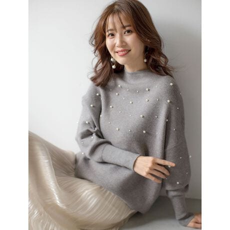 パール調モチーフが上品なプルオーバーです。スカートにも、パンツにも合わせやすいレングスは前後差を付けて気になる腰周りをカバーしてくれます。スッキリとしたシルエットになるよう、脇に切り替えをいれて仕上げているのもこだわりポイントです。パフな袖口がフェミニンで上品に映える1枚です。