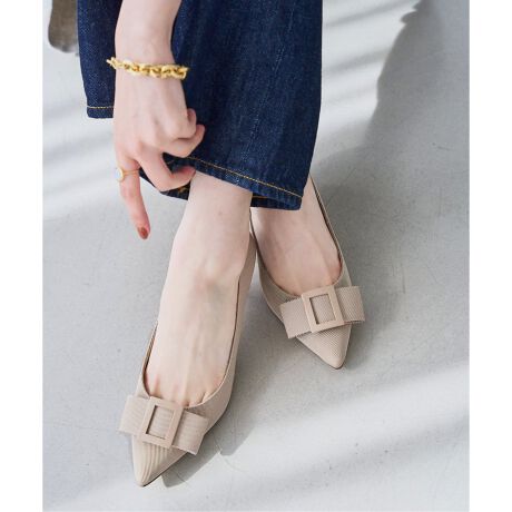 リボンモチーフのバックルがポイントのパンプス。
