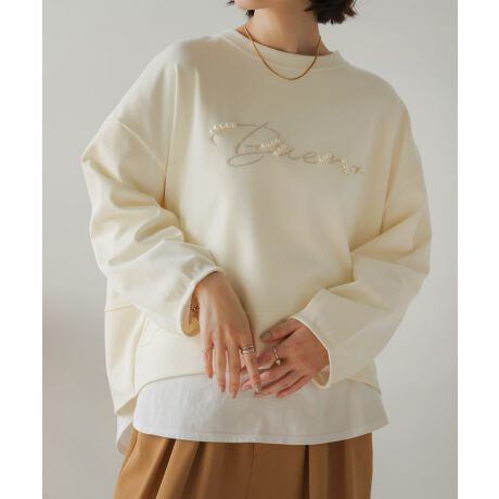 パールと刺繍がコンビネーションされたロゴがポイントのプルオーバーです。バックスリットが後ろのスタイルもこなれた印象に仕上げてくれます。