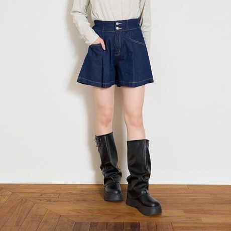 美脚見えタックフレアデニムキュロット