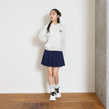 プリーツ風のスカートはシンプルなミニ丈で、幅広いトップスにマッチ。