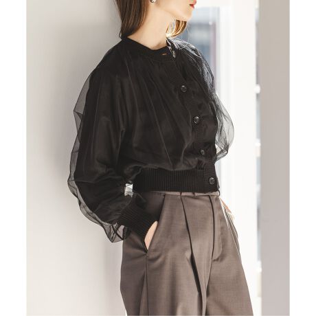 その名の通りギャザーを寄せたチュール素材を重ねた1枚で着映えるニットカーディガン。