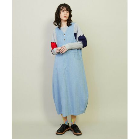 【素材】程よい肉感と見た目以上に伸縮性のあるストレッチ性のあるインディゴ素材を使い。ブリーチ加工で色を落としたサックスとワンウォッシュ加工のネイビーの2色展開。【デザイン】ゆったりとしたコクーンシルエットのジャンパースカートは上半身はデニムジャケットのディテールを取り入れ、スカート部分はリメイクしたかの様な面白いデザインがポイント。Vネックのノースリーブはどんなインナーとも相性がよく、合わせるインナーによってカジュアルにもモードにもスタイリングの幅が広がります。【ブランド情報】FRAPBOIS/フラボア2001年にブランドスタート。「大人げない大人の服」をコンセプトに、大人が着るリラックスしたデイリーウェアを提案するコレクションブランド。レディースとメンズのアイテムをご用意しています。