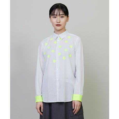 【素材】綿特有の優しい肌触りのストライプ素材は80Sの糸を使用して薄手で程よい軽さを出しています。トラッドな柄で甘過ぎない点も◎。そこに蛍光カラーの鮮やかなプリントと同色のポリエステル素材を袖口に施しています。【デザイン】ベーシックなシャツは程よいゆとりと、キメ過ぎないヌケ感が出ています。トラッドな雰囲気のシャツ生地をベースに鮮やかな蛍光カラーの別布が袖口に付いてインパクトを出しています。フロントにも同色の鮮やかなドットプリントが存在感とモードな雰囲気を出しています。*こちらの商品はユニセックス商品です。洗濯表示洗濯:液温は30℃を限度とし、洗濯機で非常に弱い洗濯処理ができる 漂白:塩素系及び酸素系漂白剤の使用禁止 タンブル乾燥:タンブル乾燥禁止 自然乾燥:日陰のつり干しがよい アイロン:底面温度150°Cを限度としてアイロン仕上げができる ドライクリーニング:ドライクリーニング禁止 ウエットクリーニング:弱い操作によるウエットクリーニングができる【ブランド情報】FRAPBOIS/フラボア2001年にブランドスタート。「大人げない大人の服」をコンセプトに、大人が着るリラックスしたデイリーウェアを提案するコレクションブランド。レディースとメンズのアイテムをご用意しています。