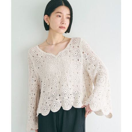 繊細なかぎ編みデザインが魅力のクロシェニットトップス