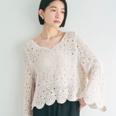 繊細なかぎ編みデザインが魅力のクロシェニットトップス