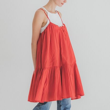 胸元にギャザーをたっぷり寄せた、ふんわりシルエットのチュニックキャミソール