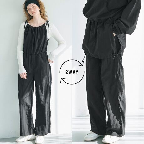 スカート付きパンツとしてトレンド感のある着こなしができるだけでなく、オールインワンとしても着用可能。