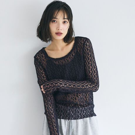 透け感のあるデザインで女性らしさを演出し、レイヤードコーデにも最適。