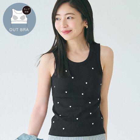OUT BRAカップ付ハート刺繍タンクトップ 全3色