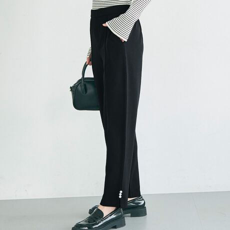すっきりとしたテーパードシルエットとセンタープレスで、美脚効果も◎。