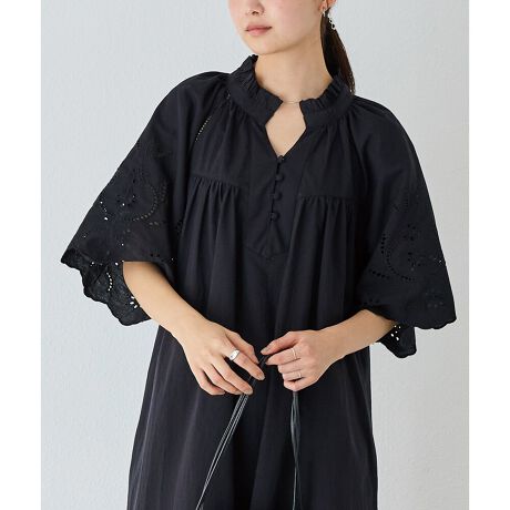 ふんわりと広がる長めの袖丈が二の腕をカバーしてくれます。肩線部分のはしごレースで、より涼し気な印象に。胸元のスリットが顔回りををすっきりと見せてくれます。