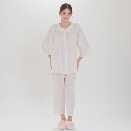 クーラー対策で 真夏でも七分袖のパジャマが快適です。ナルミのパジャマはサイズもゆったりしていてデザインも素敵です。