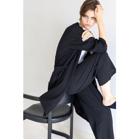 ・ゆったりとしたサイズ感と膝下丈、肘まで隠れる袖丈。