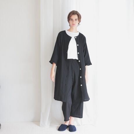 ・着崩れしないように襟ぐりは縫い代を同素材で包み込み仕上げをし、肌あたりを軽減。