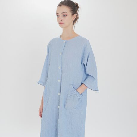 ・ゆったりとしたサイズ感と膝下丈、肘まで隠れる袖丈。