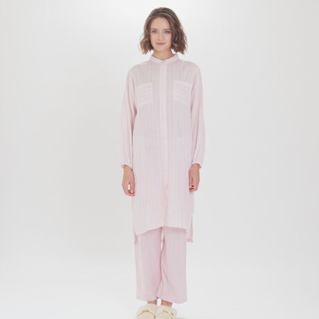 1枚2役、羽織としても使えるゆったりしたサイズ感の前開きワンピースとパンツのセットアップ。
