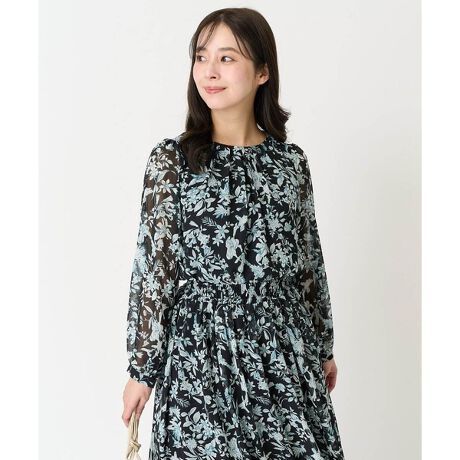 繊細なタッチで表現された花柄のシフォンブラウス。開きすぎないラウンドネックの衿元のタックデザインが女性らしい上品さのあるブラウスです。