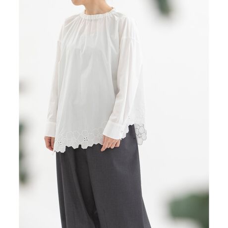 裾にフラワーモチーフのカットワーク刺繍をほどこしたプルオーバーシャツ。パリッとした生地のシャツに直線モチーフの刺繍をランダムに並べ、甘すぎない雰囲気に。ギャザーがポイントのボトルネックは、ゴム入りで綺麗な衿のシルエットを演出し、楽に着用頂けます。ジャケットや、トレーナーやニットの裾から刺繍を出して、こなれたレイヤードがかなうアイテムです。--------------------