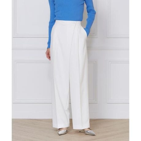 程よいワイドシルエットでフロントをラップデザインに仕立てたパンツ。ふくらみのある二重織素材を使用することで着用時のフォルムが引き立ちます。ボディラインを拾いずらいのも嬉しいポイント。フロントをラップデザインにすることで腰高効果もあり、足元はパンプスからサンダルまでどんなシューズともバランス良く合わせていただけます。オンオフ問わず幅広く活躍してくれる万能なパンツです。・裏地あり・ポケットあり・ウエスト後ろ部分ゴム仕様・水洗い可■サンプル撮影商品■こちらの商品はサンプルでの撮影となっております。実際の商品とは、サイズや色味、素材、デザイン等の仕様が若干変更になる場合がございます。