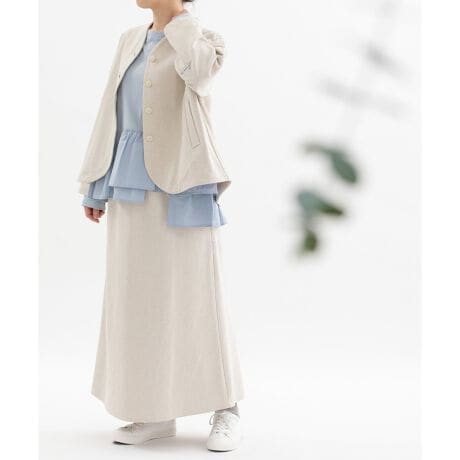 綿麻素材のノーカラージャケット。きちんと見えながらもゆったりとした着やすいシルエット。後ろが高めのネックラインに浅めの前あわせ、バックスタイルはラップデザインでポイントになっています。左ひじにさり気なく入れた文字刺繍が今年らしさのある1枚です。刺繍=「私の好きな」を仏語で入れています。