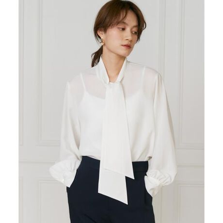 上品な梨地ジョーゼットを使用したボウタイブラウス。少し落とした肩ラインと程よいボリューム感のある袖のデザインが、こなれ感のある雰囲気を演出します。トレンドのジレスタイルを格上げし、1枚でも様になるボウタイブラウスです。・水洗い可■サンプル撮影商品■こちらの商品はサンプルでの撮影となっております。実際の商品とは、サイズや色味、素材、デザイン等の仕様が若干変更になる場合がございます。
