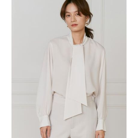上品な梨地ジョーゼットを使用したボウタイブラウス。少し落とした肩ラインと程よいボリューム感のある袖のデザインが、こなれ感のある雰囲気を演出します。トレンドのジレスタイルを格上げし、1枚でも様になるボウタイブラウスです。・水洗い可■サンプル撮影商品■こちらの商品はサンプルでの撮影となっております。実際の商品とは、サイズや色味、素材、デザイン等の仕様が若干変更になる場合がございます。