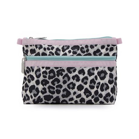 モノトーンのレオパード柄に、優しいライラック(紫)のロゴテープと、ブルー(青)のファスナーを合わせ、ちょっと甘めの印象に仕上げました。