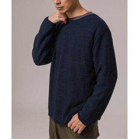 襟元をルーズに仕上げたリラックスニット。ネック部分だけでなく、襟周りや袖口もリブ仕上げにしていないため、抜け感があり、軽やかな着こなしが楽しめます。