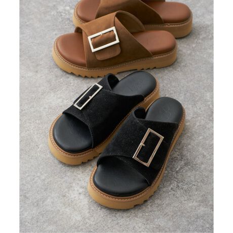 ボリュームソールと大きめのバックルがポイントのフラットサンダル。