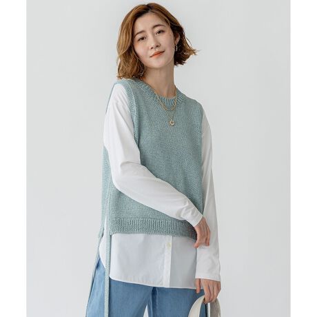 存在感のあるイタリア素材のリリヤーンで編み立てたクルーネックのニットベスト。脇には同素材の総針テープでアクセントに付けてスリットを開けてニュアンスを出しています。シャツやカットソーの上に合わせるだけで、存在感のあるアイテムです。カラーは、ニュアンス感のあるグレー(#004)、落ち着いた雰囲気のベージュ(#033)、印象的なライトグリーン(#962)の3色展開です。