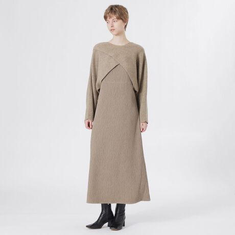 クロップド丈のカシュクールニットとキャミドレスのコンビネーションアイテム