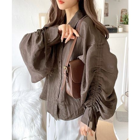 トレンドのシアー感が魅力の「2wayカラー袖シャーリングシャツブラウス」。
