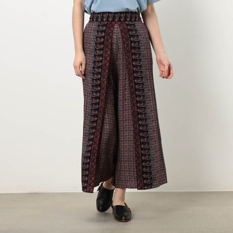 【WALDO】サイドに継ぎ目のない巻きスカートにも見えるパネルプリントパンツ。ウエストはゴム仕様になっておりリラックス感ある履き心地。派手さと落ち着き両方を兼ね備えた大人柄が特徴です。素材は洗えるレーヨン素材を使用しておりシーズンレスで着用ができます。