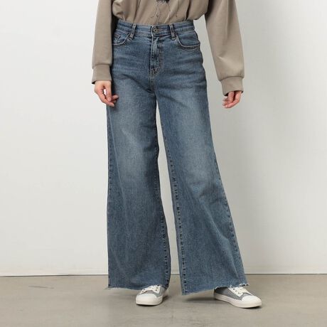 裾に向かって広がるすっきりとしたバギーラインが特徴のデニムパンツ。ウエストは平ゴム仕様でストレスなく着用ができ、裾は断ち切りになっておりお好みでカットが可能です。