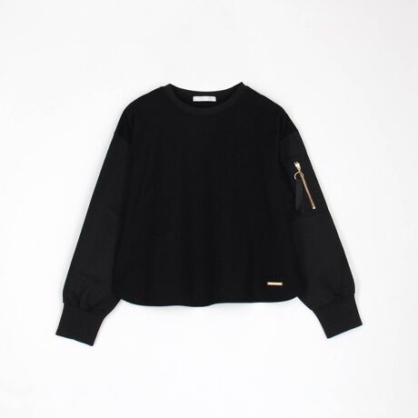 異素材使いが高見えする程よくゆったりしたサイズ感のロングTシャツは、袖をMA-1仕様にしてミリタリー要素をアクセントに。無骨にならないよう裾をラウンドにし丸みのあるレディライクなシルエットにしています。