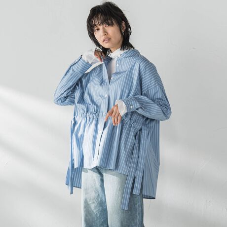 心浮き立つカラーストライプで仕立てた、ウエストマークのオーバーシャツ。